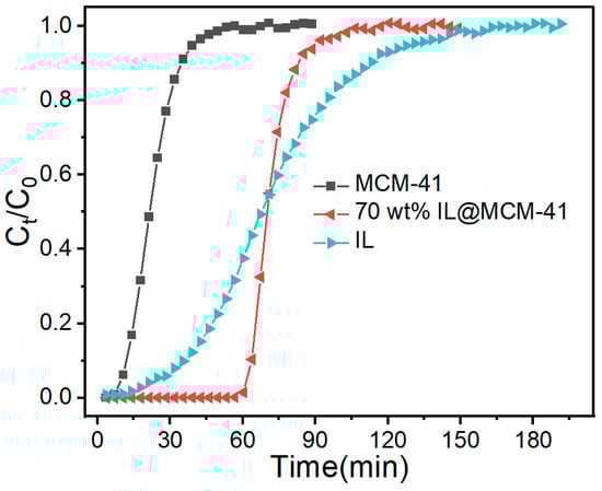 Breakthrough curves of C2H4 over MCM-41, 70 wt% IL@MCM-41, and bulk IL measured at 298 K and 100 kPa.