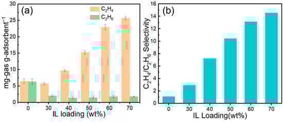 Figure 14 shows the C2H4 and C2H6 capacities, together with the corresponding selectivities, of the adsorbents at various IL loadings. As illustrated, increasing the IL content markedly enhances the C2H4 uptake—from 6.47 mg/g at 0 wt% to 25.68 mg/g at 70 wt%—whereas the C2H6 uptake decreases slightly. As a result, the C2H4/C2H6 selectivity rises sharply from 1.10 to 15.59. Notably, the 70 wt% IL@MCM-41 composite exhibits a markedly enhanced dynamic separation performance compared with the bulk ionic liquid, as evidenced by its steeper breakthrough front, narrower mass-transfer zone, and substantially higher C2H4/C2H6 selectivity under identical breakthrough conditions. This result highlights the critical role of mesoporous confinement in improving mass-transfer efficiency while preserving strong Ag+–C2H4 interactions [22].