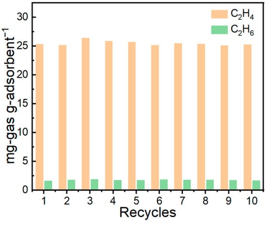 Cyclic adsorption–desorption measurements (Figure 15) demonstrate that the IL@MCM-41 composite possesses excellent operational stability. After ten consecutive cycles, the material retains essentially unchanged adsorption performance, maintaining a C2H4 uptake of 25.47 mg/g, a C2H6 uptake of 1.77 mg/g, and a C2H4/C2H6 selectivity of approximately 15.43. The negligible variation across cycles confirms the robustness of the Ag+ active sites, the stable distribution of the ionic liquid within the mesoporous channels, and the outstanding regenerability of the composite under repeated adsorption–desorption operation.