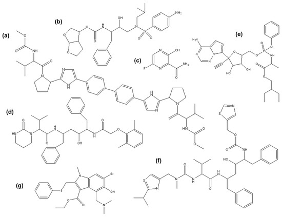 Chemical structures of: (a) DCV; (b) DRV; (c) FAV; (d) LOP; (e) REM; (f) RIT; (g) UMI.