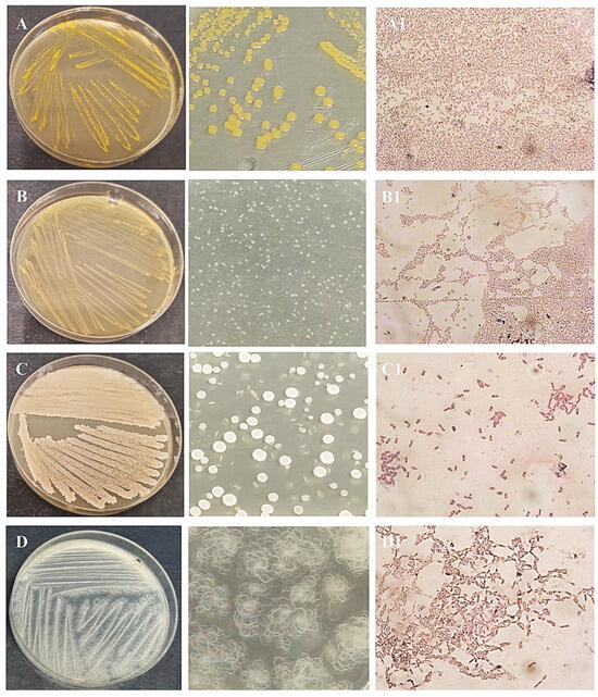 Obtained pure culture by streaking method and microphotographs of Gram staining of bacteria isolates I1 (A,A1), I2 (B,B1), I3 (C,C1), and I4 (D,D1), M = 1000×.