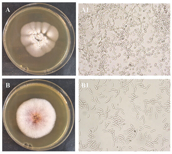 Obtained pure culture by streaking method and microphotographs of fungi isolates I5 (A,A1), and I6 (B,B1), M = 400×.