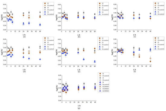 Changes in logarithmic CFU values of isolates I2, I3 and I4, during 48 h of biodegradation of: (a) DCV; (b) DRV; (c) FAV; (d) LOP; (e) REM; (f) RIT; (g) UMI.