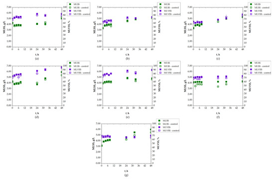 Changes in MLSS and MLVSS of AS during 48 h of biodegradation of: (a) DCV; (b) DRV; (c) FAV; (d) LOP; (e) REM; (f) RIT; (g) UMI.