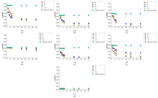 Changes in concentration of (a) DCV; (b) DRV; (c) FAV; (d) LOP; (e) REM; (f) RIT; (g) UMI during 48 h of biodegradation by I2, I3, I4 and AS.