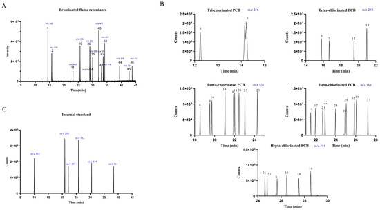 Chromatograms obtained for all the analytes: (A) BFR: 2,4,6-Tribromophenol (1), Allyl 2,4,6-tribromophenyl ether (2), Tetrabromo-o-chlorotoluene (11), 2,3,4,5,6-Pentabromotoluene (19), Hexabromobenzene (30), 2,2′,4,4′-Tetrabromo diphenyl ether (36), Pentabromobenzylacrylate (40), 2,2-Bis(4-allyloxy-3,5-dibromophenyl)propane (41), 2-ethylhexyl-2,3,4,5-tetrabromobenzoate (43), 1,2-bis (2,4,6-tribromophenoxy)ethane (45), Bis (2-ethylhexyl)-3,4,5,6-tetrabromo-phthalate (46), Hexabromocyclododecane (α,β,γ) (34,42,44); (B) PCB: PCB-18 (3), PCB-31 (4), PCB-28 (5), PCB-52 (6), PCB-44 (7), PCB-95 (8), PCB-101 (9), PCB-99 (10), PCB-81 (12), PCB-77 (13), PCB-110 (14), PCB-151 (15), PCB-123 (16), PCB-149 (17), PCB-118 (18), PCB-114 (20), PCB-146 (21), PCB-153 (22), PCB-105 (23), PCB-138 (24), PCB-126 (25), PCB-187 (26), PCB-183 (27), PCB-128 (28), PCB-167 (29), PCB-177 (31), PCB-156 (32), PCB-157 (33), PCB-180 (35), PCB-169 (37), PCB-170 (38), PCB-189 (39); (C) internal standard: 2,4,6-Tribromophenol-3,5-d2 (m/z 332), PCB 77-d6 (m/z 298), 2,3,4,5,6-Pentabromo-toluene-13C6 (m/z 492), PCB 156-d3 (m/z 363), 2-ethylhexyl-2,3,4,5-tetrabromobenzoate-d17 (m/z 439), 1,2-bis(2,4,6-tribromophenoxy) ethane-d4 (m/z 361).