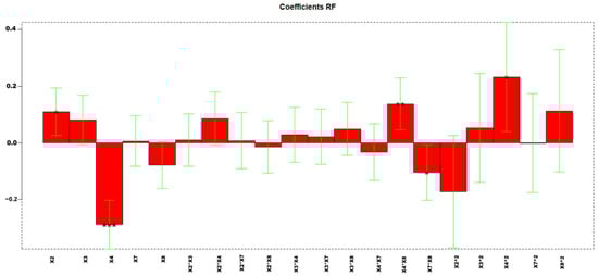 In total, 58 experiments were performed to obtain the models with explained variances of 77.38%. Figure 3 shows the regression coefficients obtained for the MLR (multiple linear regression) model. The list of variables is reported in Table 4.