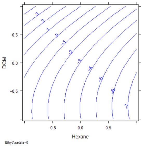 In preliminary experiments, the recovery and matrix effect of two commonly used SPE cartridges were firstly evaluated: LC-Si and LC-Florisil [16,30,31,32]. Following the procedures reported in the literature, we tested the two cartridges both in series and separately. LC-Florisil proved to give the best results without having to be used with LC-Si. We also performed extractions with various solvents including hexane, EtAC, and DCM. However, the use of only one solvent for extraction was not possible due to the physicochemical differences between the analytes investigated. A full-factorial design was constructed with a total of 23 experiments (18 experiments and 5 replicates) at 10 MQL concentration level to maximize analyte recoveries (Rec%) (Equation (1)).