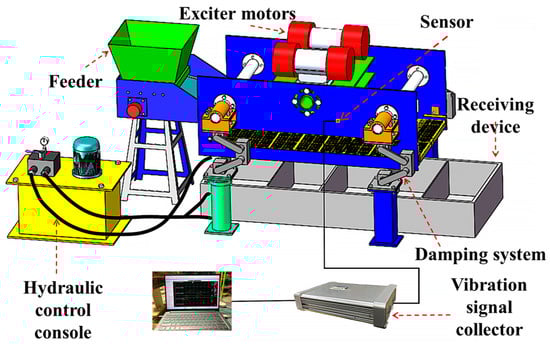 The screening and testing system, as shown in Figure 1, is composed of a feeder, a vibrating screen, and a vibration signal analysis system. The feeder is driven by a vibration motor to achieve uniform material supply, with the feeding rate adjustable based on the motor’s vibration frequency. The vibrating screen primarily includes vibration exciter motors, a hydraulic control console, a vibration-damping system, a material receiving device, and a rigid–flexible coupled screen surface. The vibrating screen measures 1.2 m in length and 0.6 m in width. Two sets of self-synchronizing vibration exciter motors form the excitation system of the vibrating screen, whose excitation force is adjusted by varying the angle between the eccentric blocks of the motors. The vibration frequency is regulated by a frequency converter, with the adjustable range of the amplitude and vibration frequency of the vibrating screen being 0–8 mm and 0–16.67 Hz, respectively.