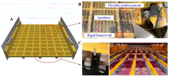 Experimental screen surface ((A) rigid–flexible coupling screen surface; (B) screen surface detail structure; (C) screen surface installation method).