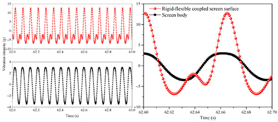 Under the conditions of a screen body amplitude of 8 mm and an excitation frequency of 15.56 Hz, the kinematic time-domain characteristics of the rigid–flexible coupled screen surface were analyzed. As shown in Figure 6, which displays the variation in vibration intensity for both the screen body and the screen surface, it can be observed that the screen body exhibits a regular, simple harmonic motion waveform with an average peak value of 3 g. In contrast, the screen surface displays a periodic, non-regular waveform with a maximum peak value of 13 g. The substantially higher vibration intensity is a prerequisite for enhancing the fragmentation and dispersion of material agglomerates. Furthermore, analysis of the time-domain characteristic curve of the screen surface’s vibration intensity reveals that significant deformation of the screen surface is the key condition for generating its high vibration intensity.
