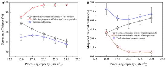 Influence of processing capacity on the rigid–flexible coupled screening performance at the external moisture content of 3% ((A) variation pattern of screening efficiency; (B) variation pattern of misplaced material content).