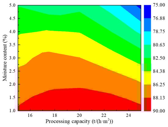 Both processing capacity and external moisture content have a significant impact on the rigid–flexible coupled screening effect. To further clarify the interaction law between the two factors on the screening effect, the influence of external moisture content on screening efficiency under different processing capacity conditions was studied. The isosurface of screening efficiency is shown in Figure 10. By conducting analysis of variance (ANOVA) and fitting on the test data, a quadratic function model between screening efficiency, external moisture content (w), and processing capacity (Q) was established, as shown in Equation (4). The external moisture content and processing capacity synergistically inhibit the screening efficiency. When the processing capacity is relatively high, the moisture has a more significant impact on the screening efficiency; meanwhile, the higher the moisture content, the more obvious the decrease in screening efficiency caused by the increase in processing capacity. To ensure the screening efficiency reaches above 85%, the ore moisture should be controlled below 3%, and the processing capacity should be maintained at 15–22.5 t/(h·m2).