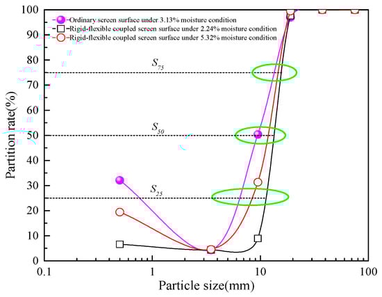 Combined with the actual production conditions of the mineral processing plant and the properties of raw ore, a process performance evaluation was conducted for the industrial application of the rigid–flexible coupled screen surface, and compared with the performance of the ordinary screen surface used on site. The aperture of the ordinary screen surface is 13 × 13 mm. In industrial processing, the moisture content of the ore is influenced by numerous factors. While it can be measured, it cannot be precisely controlled. Industrial trials were conducted using two types of screen surfaces, both under a consistent ore feed rate of 17.5 t/(h·m2). When the external moisture content of the ore was 2.24% and 5.32%, the corresponding screening efficiencies of the rigid–flexible coupled screen surface were 93.11% and 82.92%, with total misplaced material contents of 0.87% and 5.71%, respectively. Table 1 presents the particle size distribution of the feed, oversize, and undersize materials for the rigid–flexible coupled screen surface at a moisture content of 2.24%. The actual yield of oversize and undersize products was calculated using the least squares method, based on which the partition curve for the screening process was plotted. The partition curves for other operating conditions were obtained using the same method, as shown in Figure 11. The partition sizes of the ordinary screen surface and the rigid–flexible coupled screen surface under different moisture conditions were 9.53 mm, 13.42 mm, and 11.84 mm, respectively, with separation deviations of 3.78, 1.1, and 3.04, respectively. In addition, according to the variation trend on the left side of the curve, it can be observed that the upward warping trend of the ordinary screen surface is the most significant—this confirms that a large number of fine particles enter the oversize products. In contrast, the upward warping trend of the distribution curve of the rigid–flexible coupled screen surface is reduced, indicating a stronger promoting effect on the penetration of fine particles through the screen.