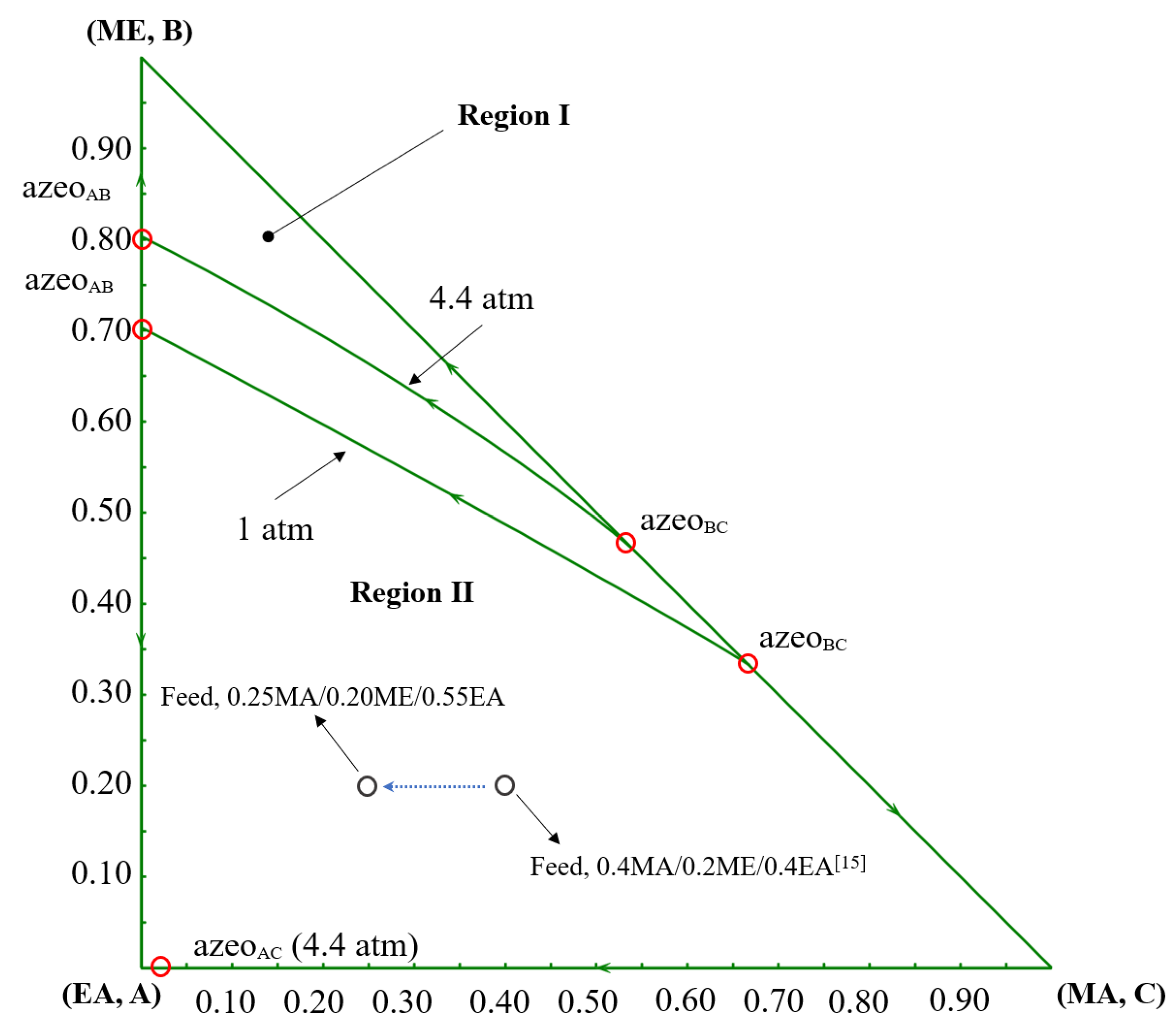 - Huang, J.H.; Zhang, Q.; Liu, C.; Yin, T.; Xiang, W. Optimal design of a ternary azeotrope separation process assisted by reactive-extractive distillation for ethyl acetate/isopropanol/water. Sep. Purif. Technol. 2023, 307, 122941. [Google Scholar] [CrossRef]