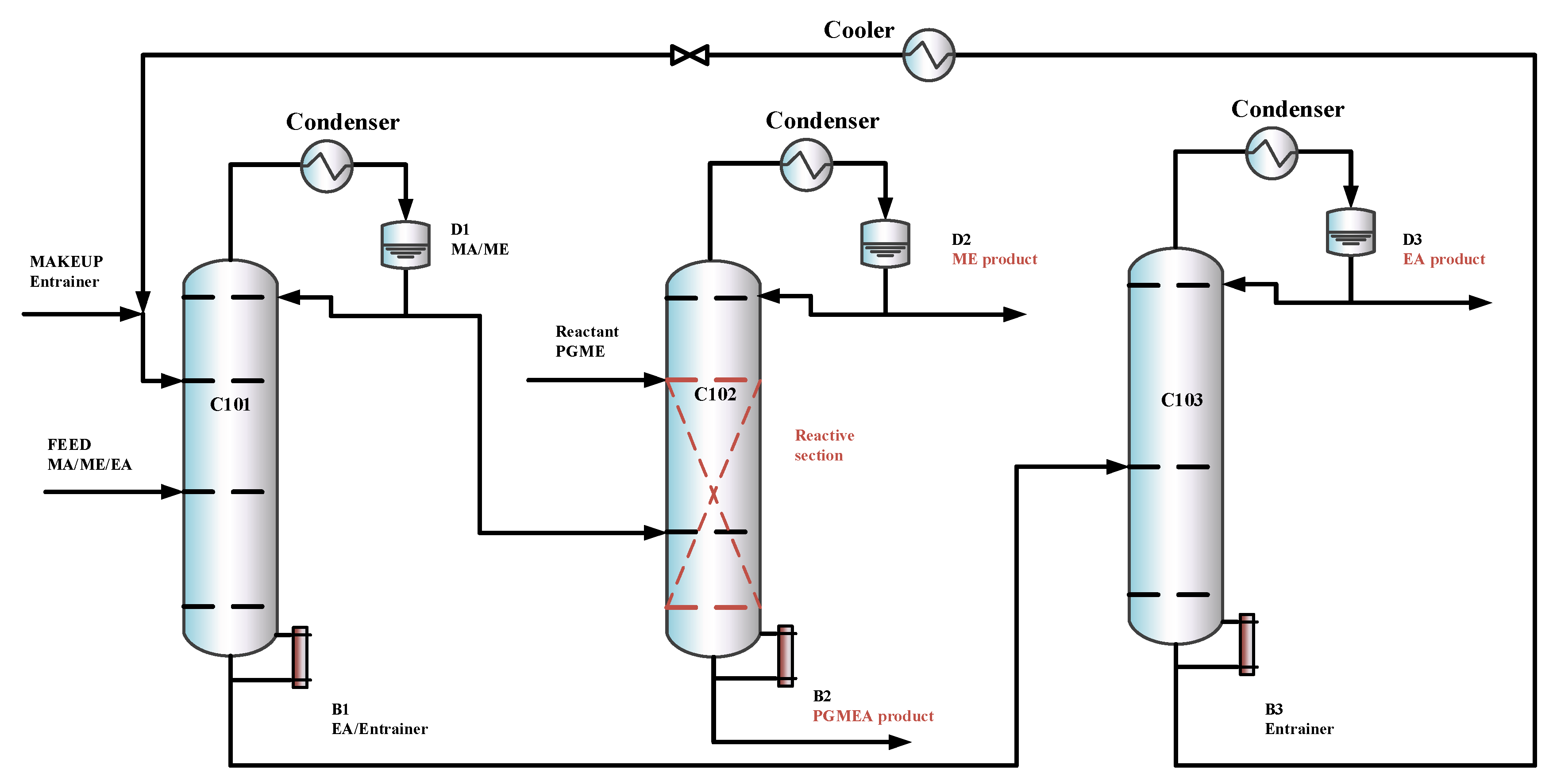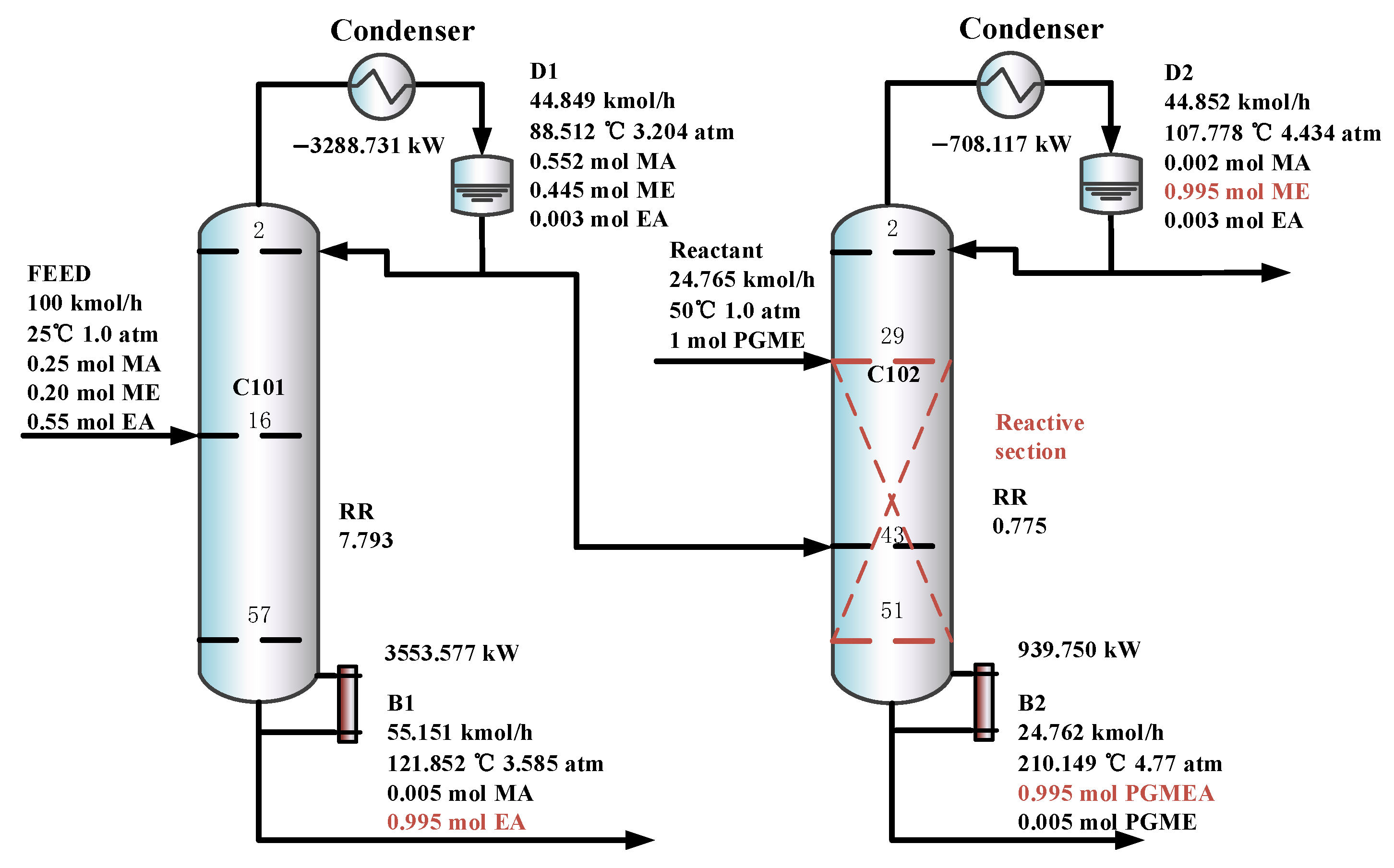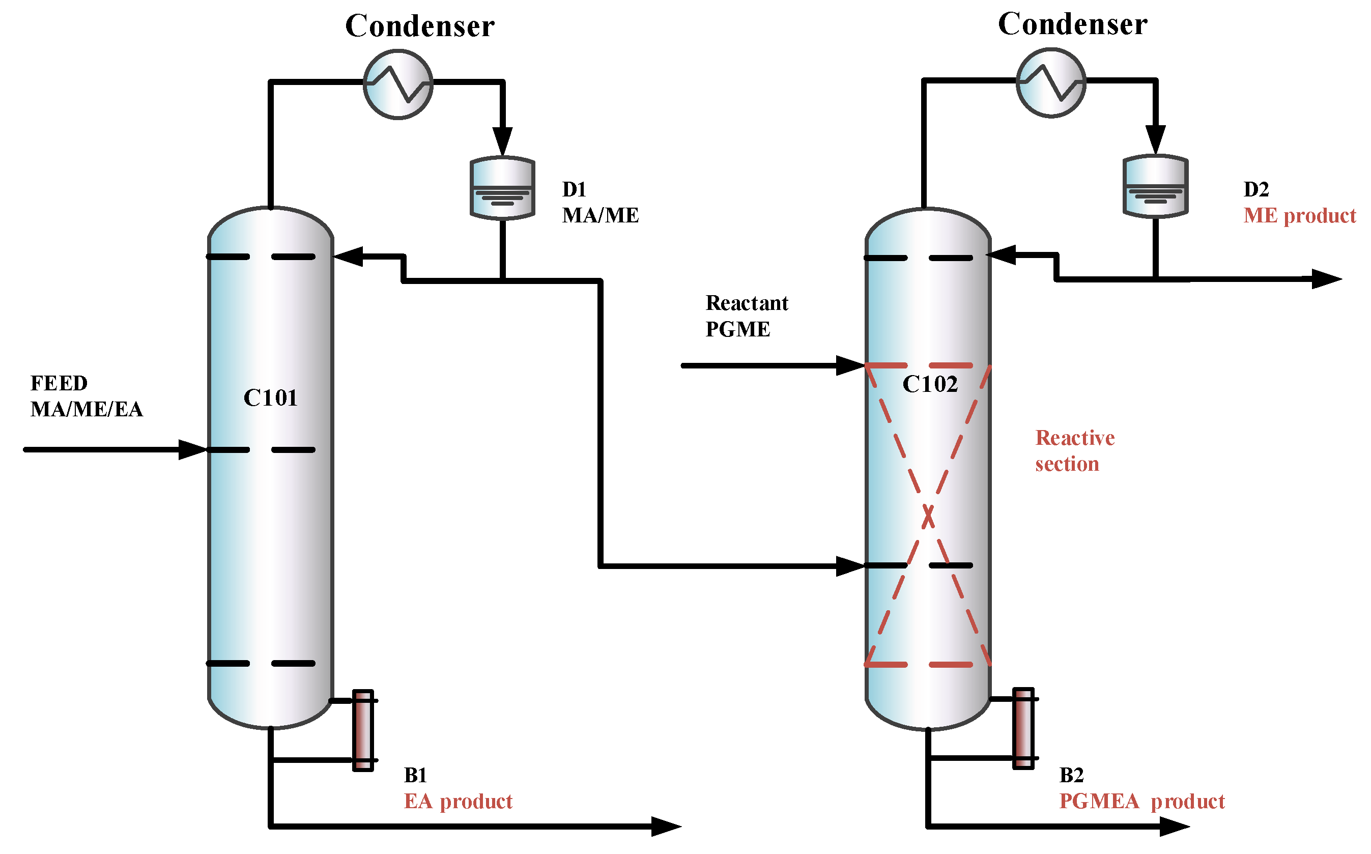 - Wang, X.; Wang, Q.; Ye, C.; Dong, X.; Qiu, T. Feasibility study of reactive distillation for the production of propylene glycol monomethyl ether acetate through transesterification. Ind. Eng. Chem. Res. 2017, 56, 7149–7159. [Google Scholar] [CrossRef]