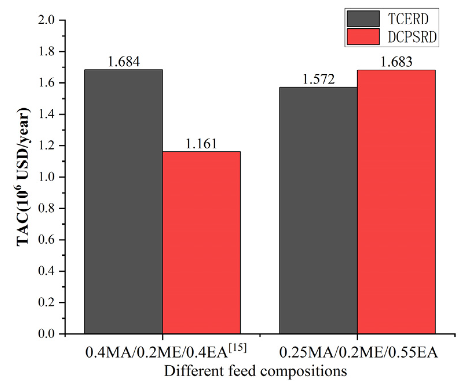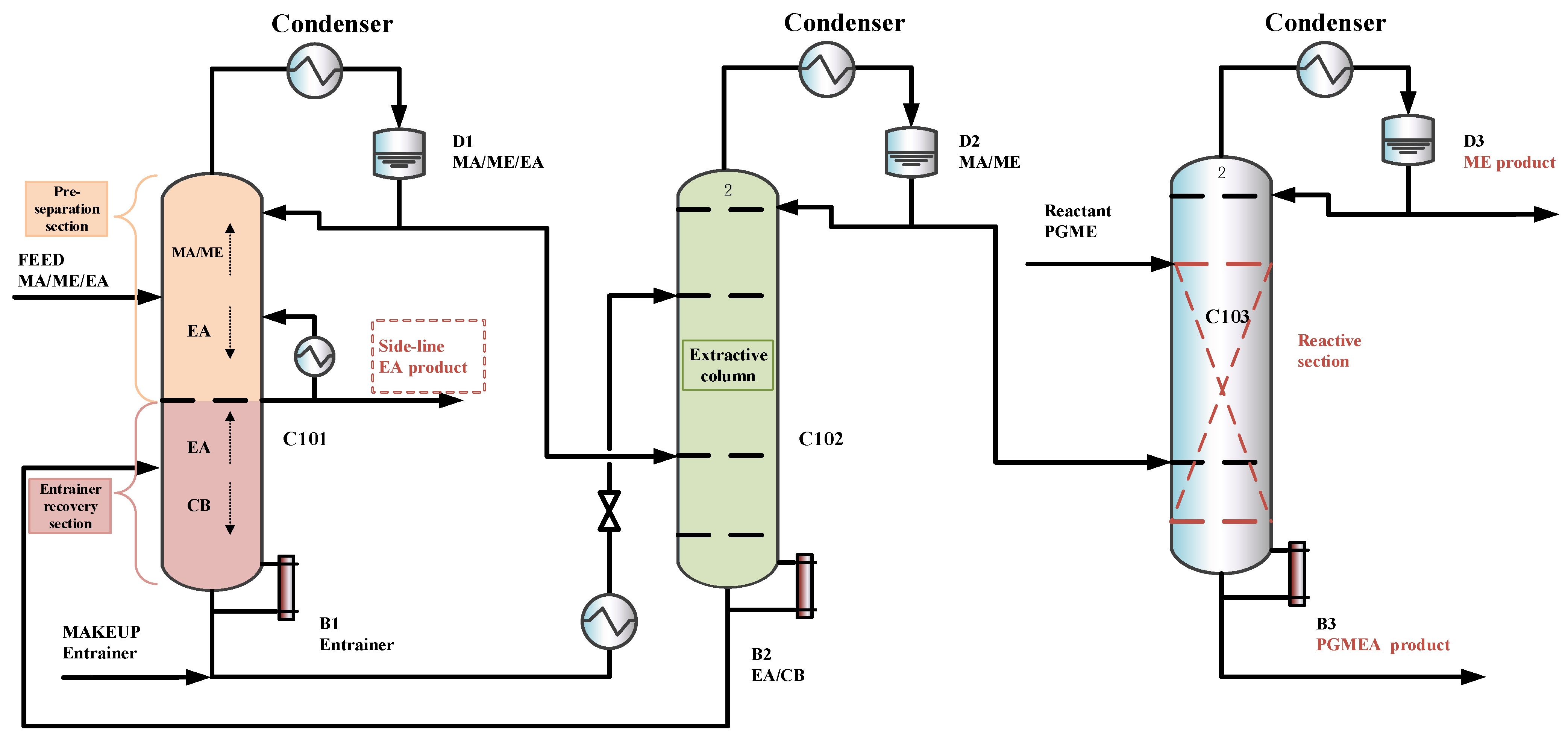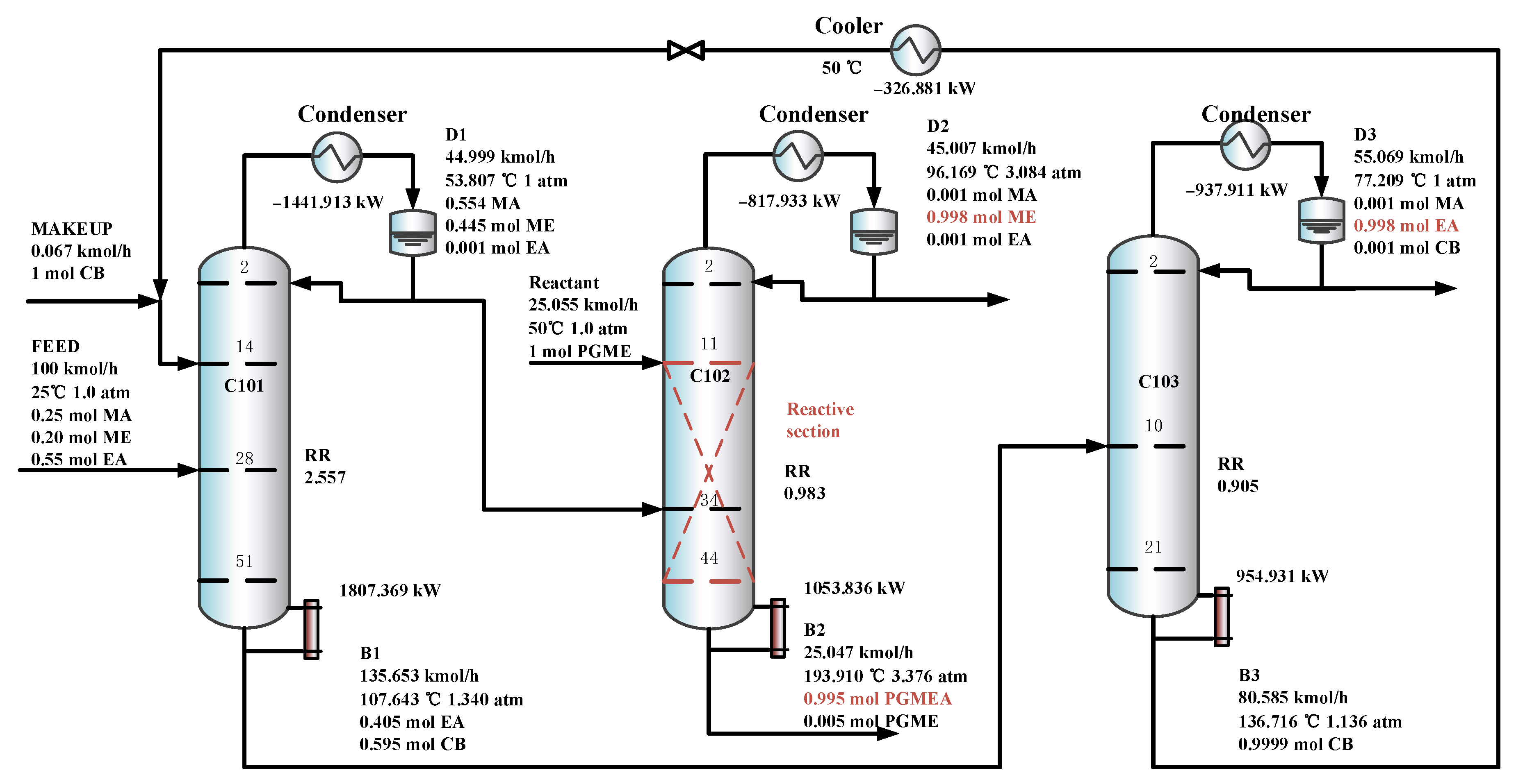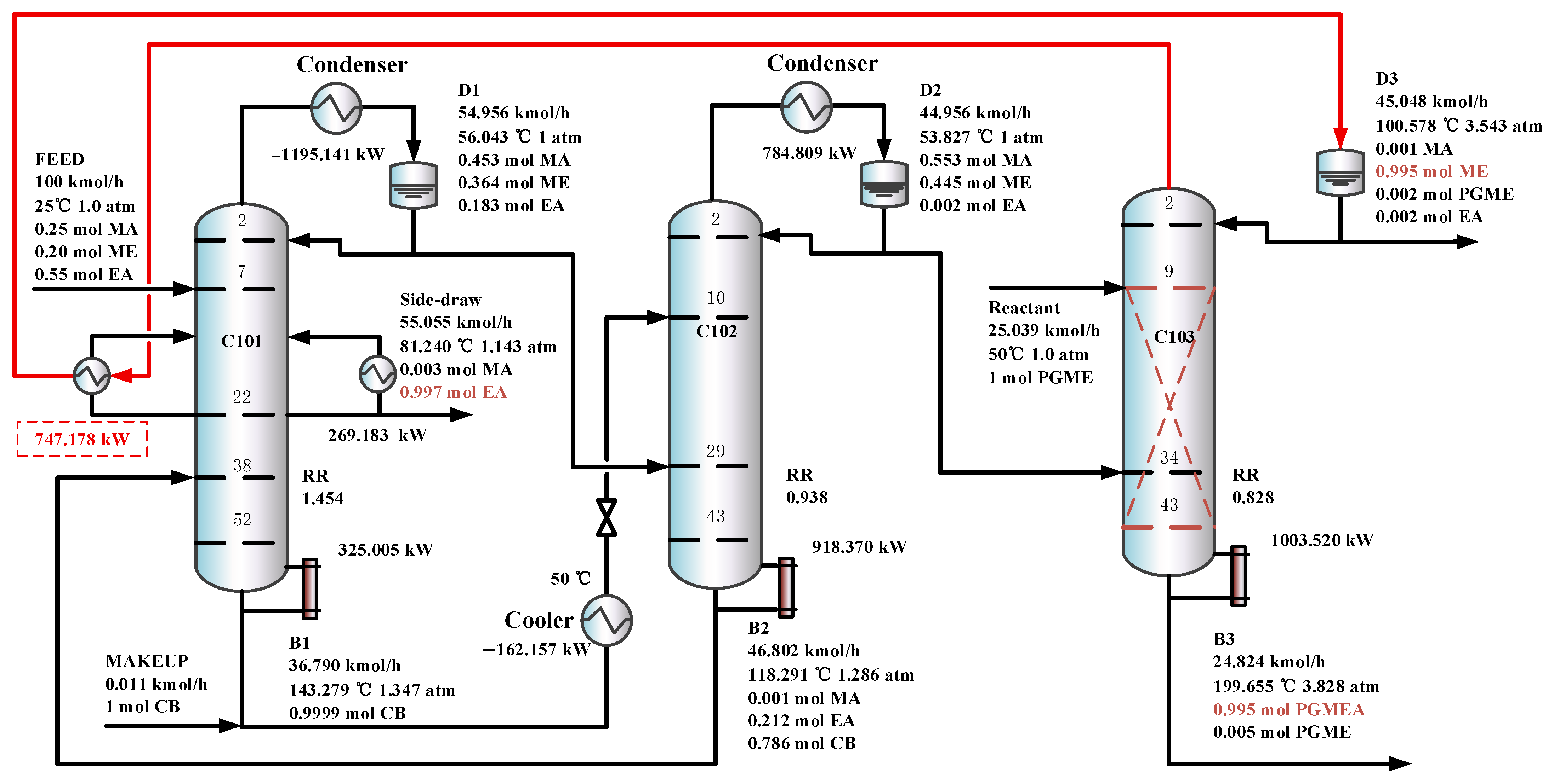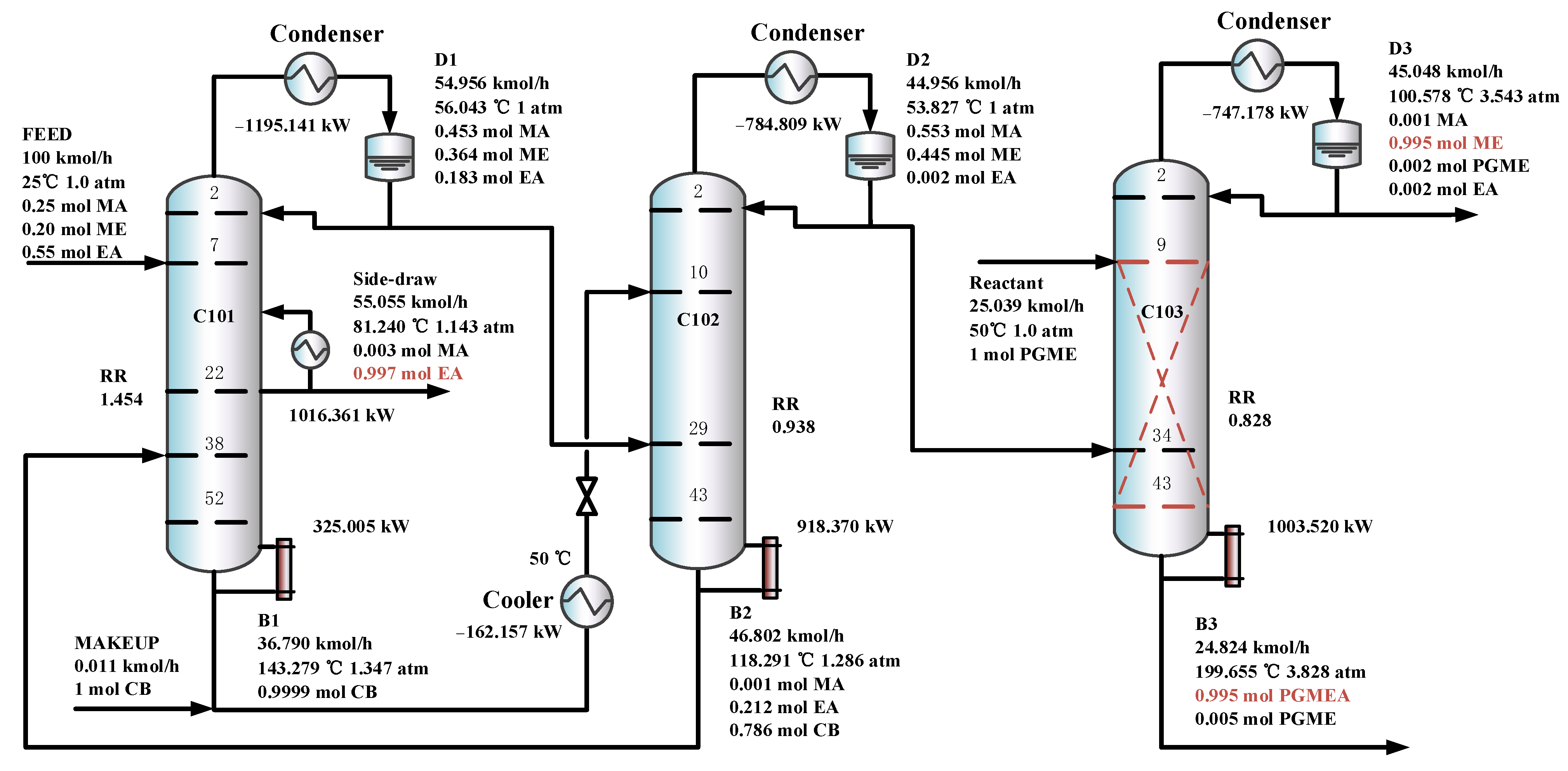 | MA | Methyl acetate | TCERD-SP-HI | Triple-column extractive–reactive distillation with a side-draw product and heat-integration |