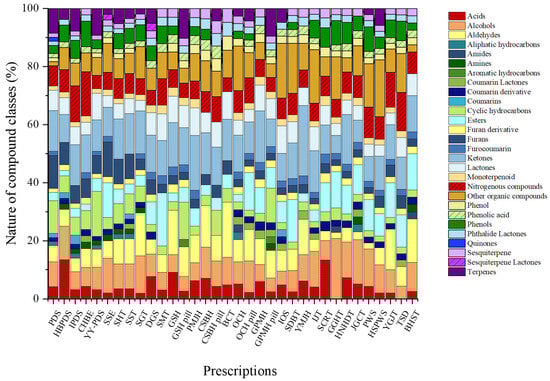 The total ion chromatograms (TICs) of all herbal medicines from the different prescriptions studied are shown in Figure S1. We used HS-SPME-GC-MS to investigate the VOCs in herbal medicine prescriptions and summarized the identified VOCs. Detailed information on the complete set of VOCs detected across all prescriptions is presented in Table S3. A total of 321 volatile compounds were annotated across all prescriptions based on library matching. These annotations reflect tentative identifications and were used to construct the comparative VOC dataset. The VOCs were classified into aldehydes, alcohols, acids, ketones, furans, furan derivatives, phenols, phenolic acids, esters, nitrogenous compounds, lactones, phthalide lactones, aliphatic hydrocarbons, cyclic hydrocarbons, monoterpenoids, terpenes, sesquiterpenes, coumarin derivatives, furocoumarins, quinones, and other organic compounds. Across the individual prescriptions, the relative contributions of chemical classes ranged from 1.4% to 41.7%.