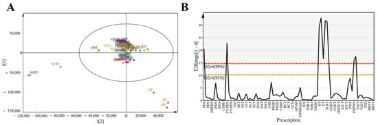 PCA simplifies complex datasets by identifying principal components that explain the variance across observations, facilitating pattern recognition among VOCs. To obtain a general overview of the data distribution, we applied exploratory PCA to the data for all 30 prescriptions (Figure 3A). Samples with strong correlations clustered together, which reinforced the correlation analysis results. All samples were Pareto scaled before analysis. Despite some clustering, considerable overlap, and proximity among prescriptions, limited complete differentiation. In Figure 3B, the red dashed line represents the 99% confidence interval for Hotelling’s T2 (T2Crit 99%), and the yellow dashed line indicates the 95% confidence interval (T2Crit 95%). Prescriptions located outside the red line were identified as outliers, whereas those within the yellow line indicated excellent model fit. For instance, IJT and SCRT exceeded the red line, suggesting relatively high heterogeneity compared with the other prescriptions.