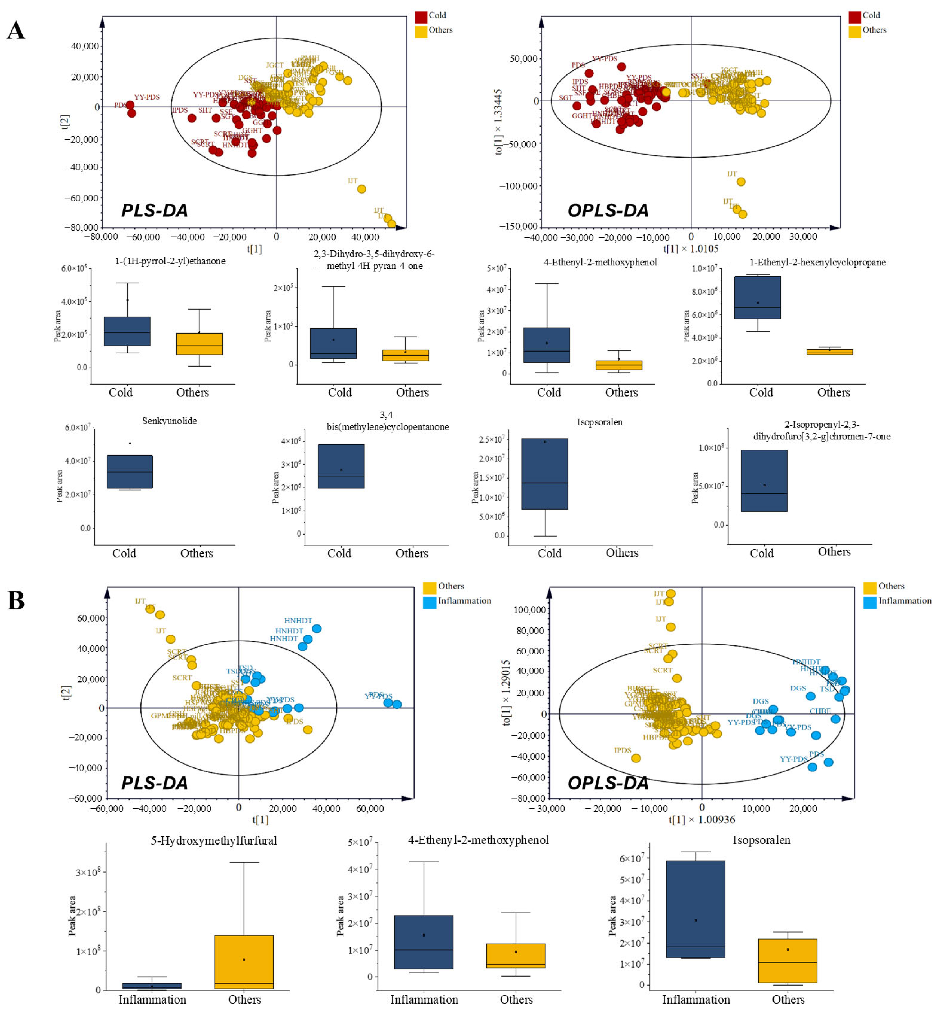 - Zhong, L.-J.; Hua, Y.-L.; Ji, P.; Yao, W.-L.; Zhang, W.-Q.; Li, J.; Wei, Y.-M. Evaluation of the anti-inflammatory effects of volatile oils from processed products of Angelica sinensis radix by GC–MS-based metabolomics. J. Ethnopharmacol. 2016, 191, 195–205. [Google Scholar] [CrossRef] [PubMed]