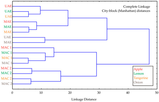 Cluster analysis was performed, and the obtained diagram is shown in Figure 2. Cluster analysis of the experimental data revealed two main clusters, showing that the cluster patterns reflect differences depending on the extraction method. The first cluster contained UAE and MAE samples, as these methods were efficient in extracting bioactive compounds, while the second cluster organized maceration methods (MAC1 and MAC2 samples), probably due to their less efficient extraction process. The linkage distance between the main clusters was almost 50.
