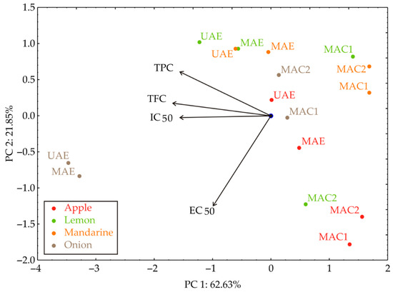 The PCA plot of the relationships between TPC, TFC, IC50, and EC50 of the investigated by-product material extracts indicated that 84.48% of the total variance in the observed variables was captured by the first two principal components (Figure 3). PCA analysis showed that the extract samples are grouped by the extraction technique; the UAE and MAE samples are mainly located in the upper left side, while MAC 1 and MAC 2 are located on the right side of the graph. According to the PCA results, the TPC, TFC, and IC50 (which contributed 28.26%, 32.58%, and 27.95% of the total variance, respectively, based on correlations) showed a negative influence on the PC1 coordinate. On the other hand, the EC50 (78.94% of the total variance, based on correlations) negatively influenced the calculation of the PC2. The results indicate that reducing power (EC50) is a distinct antioxidant mechanism, largely independent of TPC and TFC.