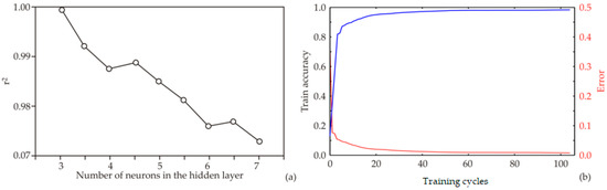The ANN architecture, including biases and weight coefficients, is strongly influenced by the initial assumptions regarding the matrix parameters, which play a critical role in constructing the network and fitting it to the experimental data. Additionally, variations in the number of neurons within the hidden layer can affect the behavior of the model. To address this, each network topology was executed 100,000 times to minimize the impact of random correlations resulting from initial parameter assumptions and weight initialization. Using this strategy, the highest r2 value during the training cycle was achieved with nine neurons in the hidden layer (Figure 4a).