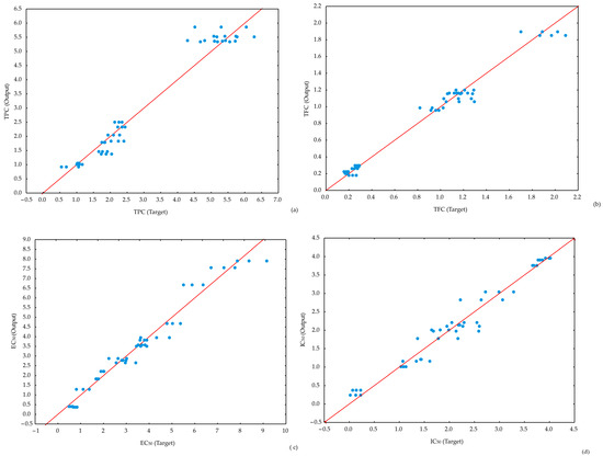 Experimentally obtained and ANN models delivered value comparison for: (a) TPC, (b) TFC, (c) EC50, and (d) IC50.