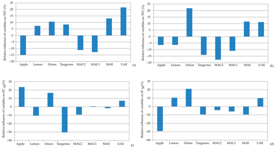 Figure 6 illustrates the effects of different by-product materials used for extraction and extraction techniques on bioactive compounds and antioxidant activities using a sensitive analysis—Yoon’s interpretation method. The sensitivity analysis revealed that among the selected by-product materials, onion skin exhibited the most positive influence, with the highest for TFC (+21.78%) and antioxidant activity, IC50 (+21.08) and EC50 (+16.62). On the other hand, tangerine peel showed the highest negative relative influence, especially in reducing power with EC50 (−30.41%) and TCF (−14.02%).