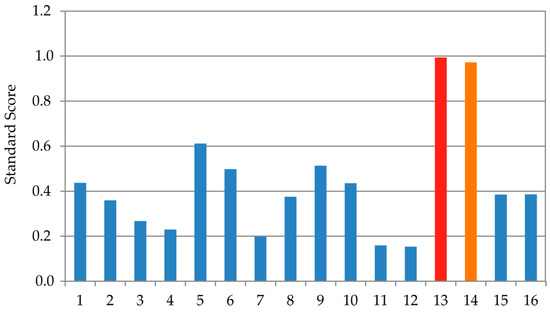 The optimization of the ANN outputs was performed by employing the results presented in Table 4, Table 5 for ANN1, Table 7 and Table 8 for ANN 2, Table 10 and Table 11 for ANN 3, and Table 13 and Table 14 for ANN 4, using Equation (1). One of the aims of this research was to optimize the TFC, TPC, EC50, and IC50, with the ANN models by utilizing the input variables (extraction technique and the type of plant waste material). The optimization was achieved using ANN1, ANN2, ANN3, and ANN4 models with the number of generations reaching 87, 63, 74, and 82, respectively. The population size for each input variable was defined as 100, and the Pareto front was represented by 50 points. Optimization using the ANN model identified sample 13 as the most favorable. To validate this result, the Standard Score method was applied, calculating the optimal score as the average across all measured parameters. Sample 13 achieved the highest overall Z-score of 0.994, indicating the best combination of the evaluated responses (Figure 7). Sample 14 was also highly rated with a combined Z-score of 0.972.