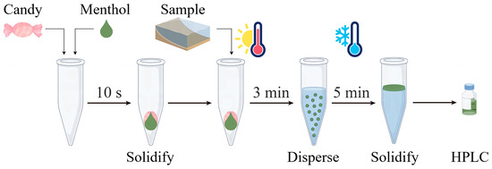 We sequentially added 300 mg of Pop Rocks candy (used as a solid dispersant) into a 10 mL centrifuge tube, followed by 200 µL of menthol (used as the extractant) whose temperature was controlled at 30 °C using a thermostatic water bath. Within 10 s, the menthol solidified on the surface of the Pop Rocks candy. Subsequently, 5 mL of the sample, preheated to 70 °C in a thermostatic water bath, was introduced into the centrifuge tube. Upon contact, molten menthol was released from the Pop Rocks candy surface within 3 min, rapidly interacting with the sample alongside the forceful emission of carbon dioxide. The centrifuge tube was subsequently placed in a −20 °C freezer for 5 min to accelerate the solidification of menthol in the upper layer. The solidified menthol was subsequently transferred into an autosampler vial and diluted with 50 µL of methanol before HPLC analysis. Figure 1 depicts the schematic diagram.