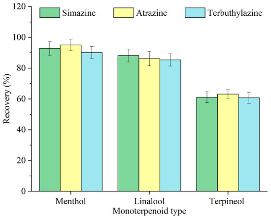The structure and physicochemical properties of extractants are essential in determining the extraction efficiency of target analytes [23]. The impact of various monoterpenoids—menthol, linalool, and terpineol—on the recovery of triazine herbicides was investigated, and the findings are illustrated in Figure 2. Among the three monoterpenoids, menthol exhibited the highest recovery. All three monoterpenoids contain a hydroxyl group; however, menthol possesses a reduced polarity and increased hydrophobicity, hence facilitating its affinity toward the hydrophobic triazine herbicides. Accordingly, menthol was selected as the optimal monoterpenoid for subsequent experiments.