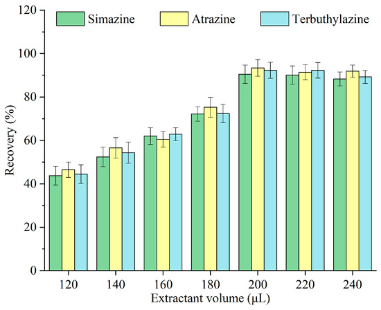 Monoterpenoids were emitted from the surface of Pop Rocks candy and dispersed throughout the sample. An insufficient quantity of monoterpenoid fails to facilitate effective extraction, whereas an excessive amount hinders the interaction between the Pop Rocks candy and the sample, thereby affecting the carbon dioxide release rate and the assisted dispersion effect. The impact of different volumes of monoterpenoids—120, 140, 160, 180, 200, 220, and 240 μL—on the recovery of triazine herbicides was investigated, and the results are illustrated in Figure 3. The recovery escalated with the monoterpenoid volume, peaking at 200 μL, after which it remained constant. When the monoterpenoid volume was insufficient, the contact area with the sample was limited [24]. After the extraction equilibrium was reached, supplementary monoterpenoid diluted the triazine herbicides in the extractant. Consequently, 200 μL was selected as the optimal volume of monoterpenoids for subsequent experiments.