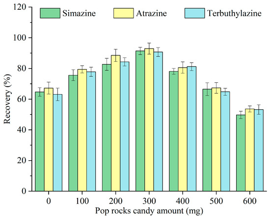Pop Rocks candy acted as a solid dispersant that, through dissolution, carbon dioxide release, and sugar-out effects, synergistically enhanced the dispersion of monoterpenoids in the sample. The popping effect arises from pressurized carbon dioxide gas encapsulated within the sugar matrix at approximately 600 psi. The sugar mass, rather than its type, was the primary variable influencing the dispersion efficiency [25]. The impact of different amounts of Pop Rocks candy—0, 100, 200, 300, 400, 500, and 600 mg—on the recovery of triazine herbicides was examined, and the results are illustrated in Figure 4. The recovery increased with the amount of Pop Rocks candy, peaking at 300 mg, and subsequently decreased. Although sugars facilitate dispersion through multiple synergistic mechanisms, excessive sugar increases the sample’s viscosity [15], thereby reducing mass transfer. Hence, 300 mg was selected as the optimal amount of Pop Rocks candy for subsequent experiments.