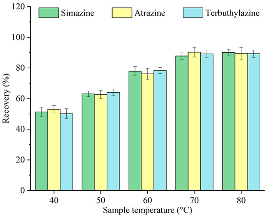 Given that menthol has a melting point of 34 °C, the sample temperature must exceed this threshold to facilitate its rapid melting. However, excessively high temperatures can extend the solidification and collection of menthol post-extraction. The effects of various temperatures of the sample—40, 50, 60, 70, and 80 °C—on the recovery of triazine herbicides were investigated, and the results are displayed in Figure 5. The recovery increased with the sample temperature, peaking at 70 °C, and subsequently remained nearly unchanged. This improvement can be ascribed to faster melting of menthol, the solubility of sugar, and the accelerated release of carbon dioxide at elevated temperatures [15]. Consequently, 70 °C was selected as the optimal sample temperature for subsequent experiments.