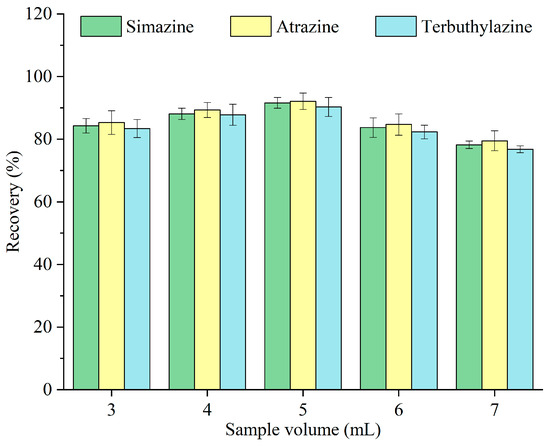 To achieve a higher enrichment factor, a larger sample volume is typically desirable; however, this may result in diminished extraction efficiency. The effects of different volumes of sample—3, 4, 5, 6, and 7 mL—on the recovery of triazine herbicides were investigated, and the results are depicted in Figure 6. The recovery was improved with increasing sample volume and peaked at 5 mL and subsequently declined. When the sample volume was minimal, more extractant droplets adhered to the tube wall due to the vigorous release of carbon dioxide, complicating their collection. Conversely, at larger sample volumes, a larger fraction of the extractant was dissolved in the aqueous phase [26], leading to extractant loss and decreased recovery. Therefore, 5 mL was designated as the optimal sample volume for subsequent experiments.