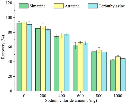Salt addition before extraction can influence the solubility of target analytes within the sample matrix, hence impacting the extraction effectiveness. The impacts of different concentrations of sodium chloride (0, 200, 400, 600, 800, and 1000 mg) on the recovery of triazine herbicides were examined, and the results are illustrated in Figure 7. The recovery decreased with increasing sodium chloride amount. As Pop Rocks candy had already acted as a sugar-out reagent, the addition of sodium chloride resulted in no further enhancement of the extraction efficiency. Its presence increased the ion strength and viscosity of the sample matrix and hindered mass transfer between the aqueous and organic phases [27]. As a result, any potential positive contribution from the ionic strength of NaCl was largely offset by these negative effects, leading to a reduced recovery. Thus, no salt was added before extraction in subsequent experiments.