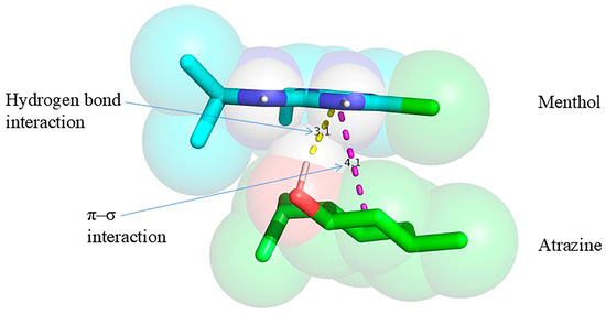 Molecular docking was conducted using menthol as the extractant and atrazine as the target herbicide. The low-energy conformations of menthol and atrazine were initially optimized utilizing AutoDock Vina 1.1.2, subsequently followed by docking simulations conducted in PyRx to calculate the binding energy. The docking results were visualized and analyzed utilizing PyMOL 2.3. Figure 9 depicts the hydrogen bond formation between the hydrogen atom of the hydroxyl group in menthol and the nitrogen atom on the triazine ring of atrazine, with an interaction distance of 3.1 Å. Moreover, a weak π–σ interaction was noted. The calculated binding energy between menthol and atrazine was −1.8 kcal mol−1, signifying a spontaneous interaction (as negative binding energy denotes spontaneous binding [29]). While the relatively low binding energy may contribute to some extent, the observed extraction efficiency is more likely influenced by general physicochemical properties such as hydrophobicity and partitioning behavior.