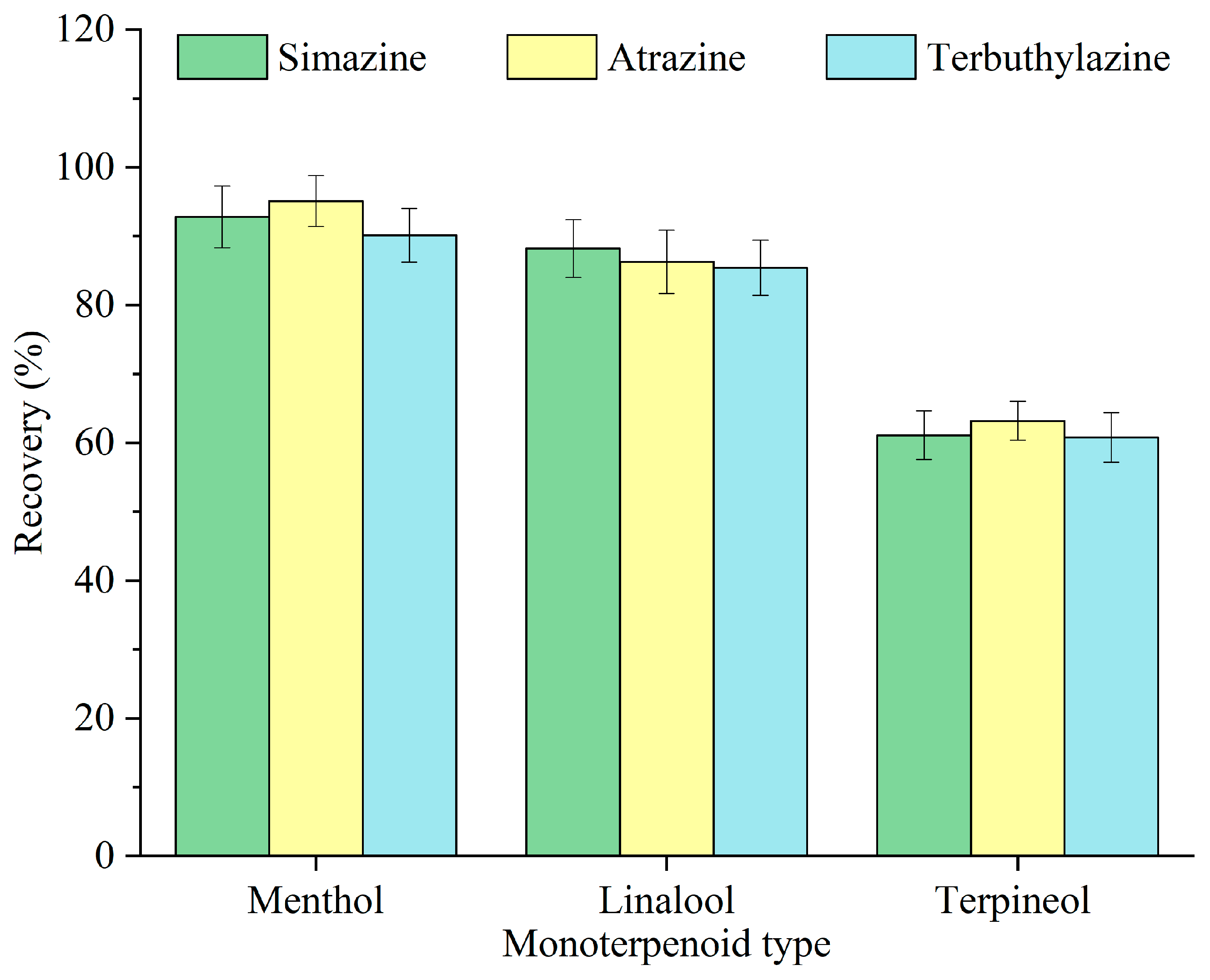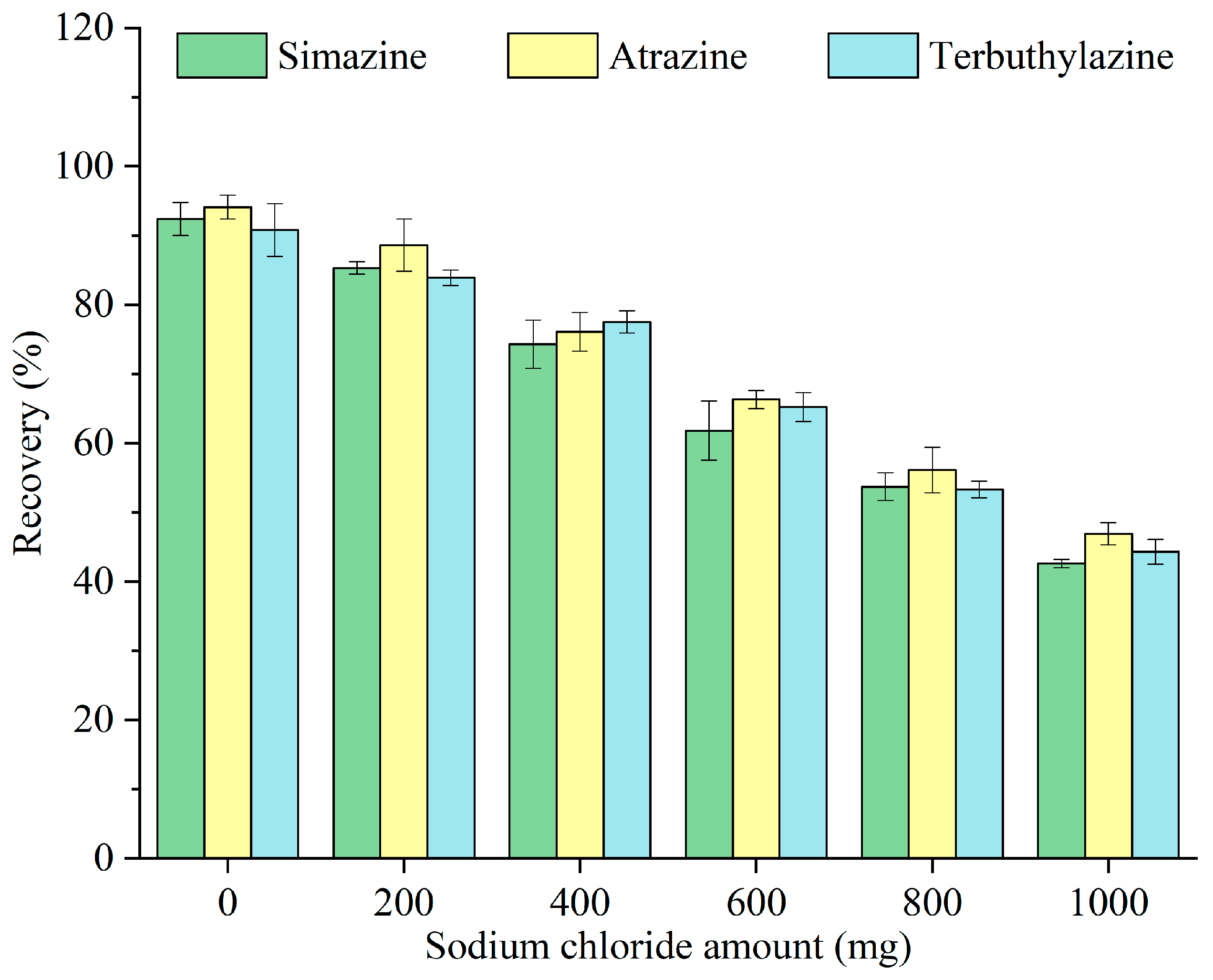 | Water | Spiked Concentration (mg L−1) | Simazine | Atrazine | Terbuthylazine | |||