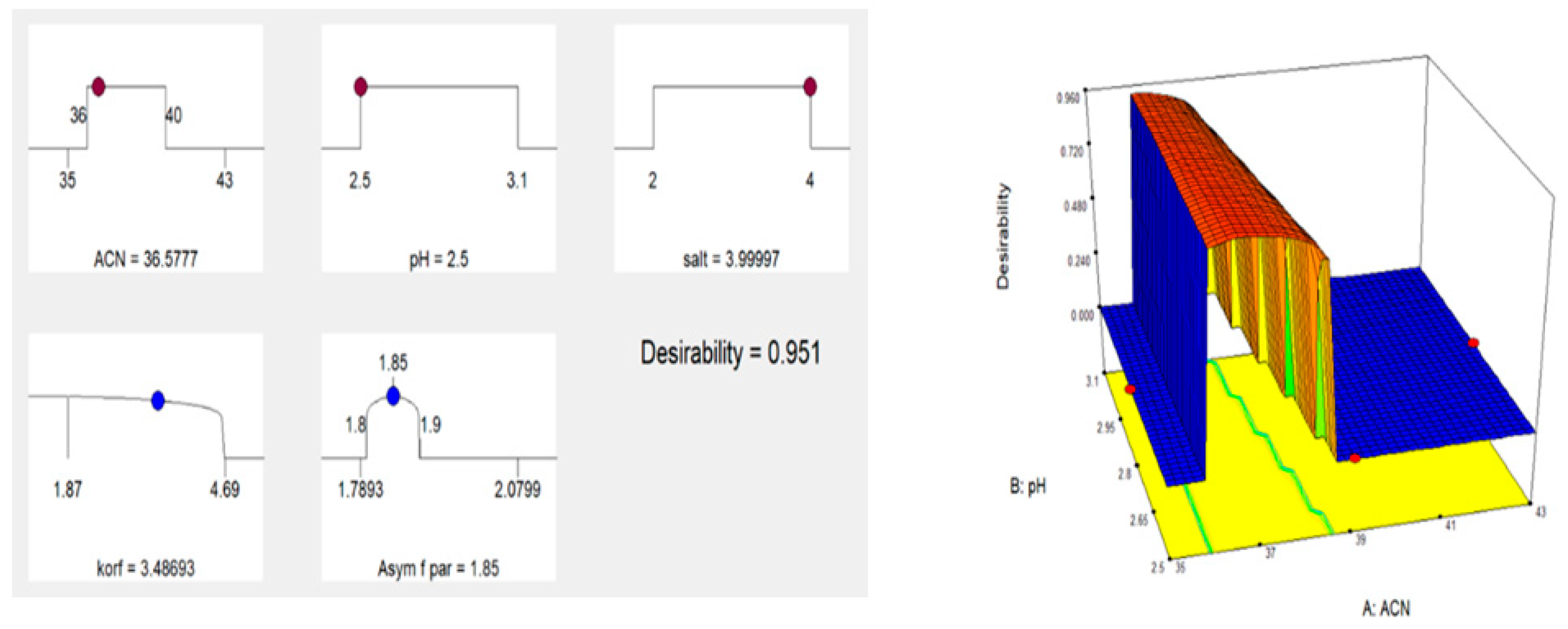 Figure 3). Specifically, the asymmetry of the PAR peak (Asym_PAR) was measured at 1.87, and the capacity factor for ORPH (k_ORPH) was 3.70, both values falling within the predicted 95% confidence intervals. These results confirm that the optimization successfully addressed the main chromatographic challenges, achieving well-resolved peaks with acceptable retention times and peak symmetry for both analytes.