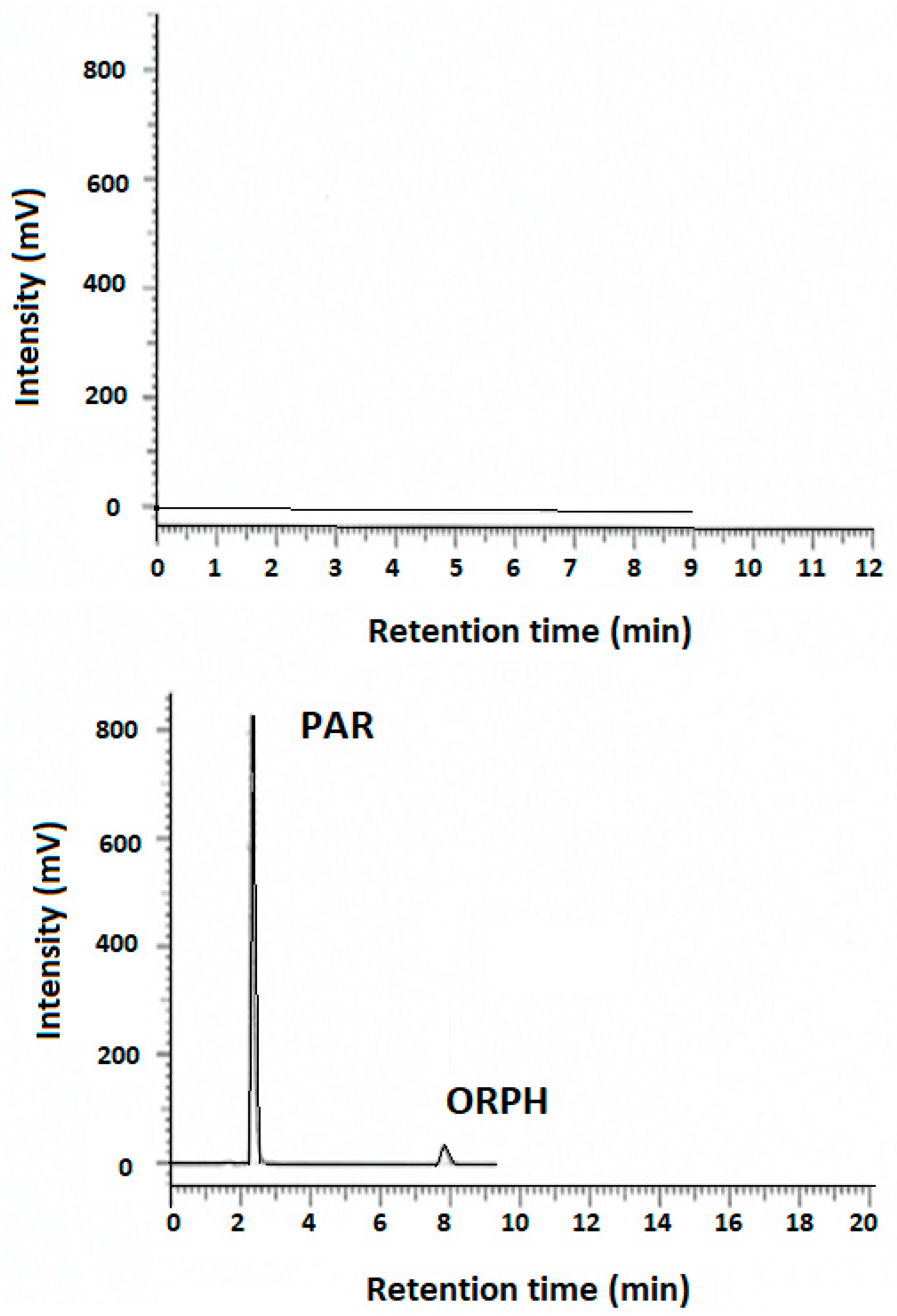 Based on literature reports, preliminary experiments tested C18 columns of various dimensions, organic modifiers such as methanol and ACN, salt concentrations and pH of the aqueous phase, and different mobile phase compositions. Although different stationary phases were evaluated, all resulted in poor retention of PAR, which eluted close to the dead time with unacceptable peak asymmetry, while ORPH either did not elute or appeared as a broad peak.