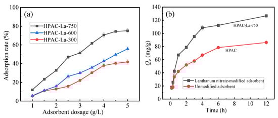 The adsorption experimental conditions were as follows: pH = 2, fluoride ion concentration 300 mg·L−1, solid–liquid ratio 0.5 g/L (HPAC-La-750), temperature 298 K, and adsorption time ranging from 0 to 12 h.