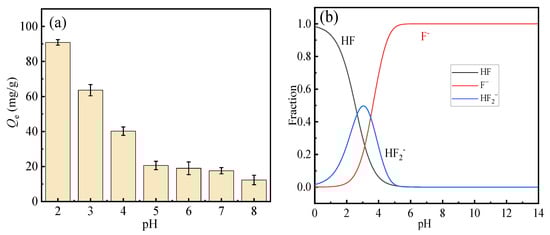 (a) Effect of pH on fluoride ion adsorption performance, (b) fluorine predominance diagram.