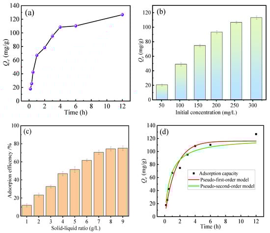 (a) Effect of adsorption time on fluoride removal, (b) Effect of initial concentration on fluoride removal, (c) Effect of solid–liquid ratio on fluoride removal, (d) Fitting curves of adsorption kinetic equations.
