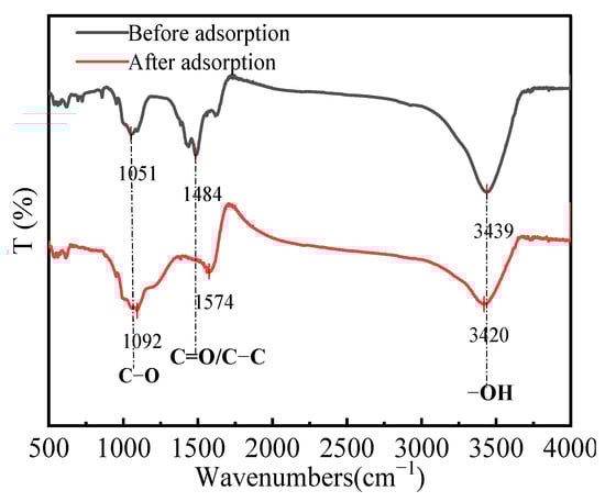 The FT-IR spectra of HPAC-La-750 before and after fluoride ion adsorption are shown in Figure 7. The comparison reveals marked changes in functional groups, elucidating the interactions with fluoride ions. Notably, shifts in the absorption peaks of hydroxyl and carbonyl groups indicate that polar surface groups participated in adsorption, likely via ion exchange. Specifically, oxygen-containing groups (-COOH and -OH) may undergo an ion-exchange process where La3+ replaces H+, subsequently forming complexes with F−. These results demonstrate that both the surface functional groups and the incorporated lanthanum contribute to the effective fluoride adsorption by HPAC-La-750.