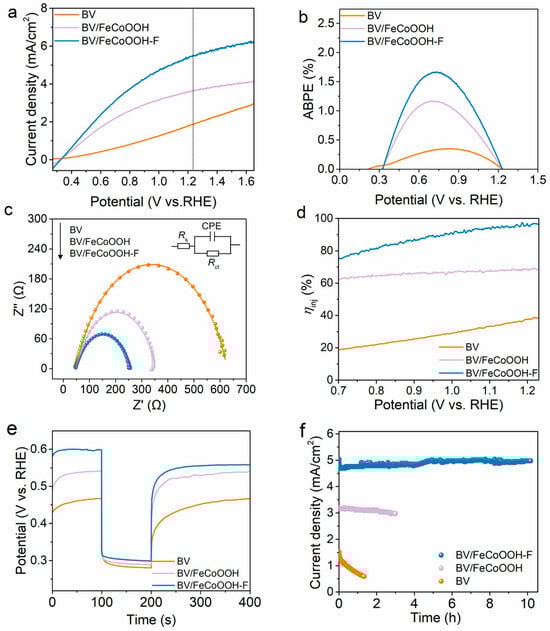 Under AM 1.5 G illumination conditions, the PEC performance of different photoanodes was evaluated using a three-electrode system. As shown in Figure 2a, the BV photoanode shows a low photocurrent density, reaching only 1.85 mA/cm2 at 1.23 VRHE, which is mainly attributed to its poor surface catalytic reaction and severe charge recombination. When FeCoOOH was loaded onto the BV photoanode, the photocurrent density of BV/FeCoOOH increased to 3.63 mA/cm2 at 1.23 VRHE. This improvement mainly originated from the boosted oxygen evolution reaction (OER) kinetics. Even so, the actual photocurrent density still had a large gap from the theoretical expectation. Surprisingly, after the introduction of F element, the optimized BV/FeCoOOH-F integrated system had a photocurrent density as high as 5.46 mA/cm2 at 1.23 VRHE, which is 2.95 times that of the BV photoanode (Figures S4 and S5). The applied bias photoelectric conversion efficiency (ABPE) of BV/FeCoOOH-F reached 1.66% at 0.73 VRHE, which was the highest among all photoanodes (Figure 2b), including BV and BV/FeCoOOH. In addition, electrochemical impedance spectroscopy (EIS) was used to explore the interfacial charge transfer behavior of different photoanodes. As shown in Figure 2c, according to the Nyquist diagram and fitting results, the Rct values show the following trend: BV (587 Ω) > BV/FeCoOOH (304 Ω) > BV/FeCoOOH-F (209 Ω). This finding indicates that the doping of F efficiently enhanced interface charge transfer kinetics. Furthermore, the injection efficiency (ƞinj) was evaluated under AM 1.5 G illumination (Figure 2d). As shown in Figure 2d, the BV/FeCoOOH-F photoanode exhibits a higher ƞinj in comparison with BV/FeCoOOH and pristine BV photoanodes at 1.23 V vs. RHE, indicating less carrier recombination. In addition, in order to further explore the origin of the increase in PEC performance, the charge separation efficiency (ηsep) was calculated. In Figure S6, the ηsep of BV/FeCoOOH-F is remarkably larger than that of BV/FeCoOOH-and BV, which can be attributed to the positive role of F engineering in the BV/FeCoOOH-F photoanode.