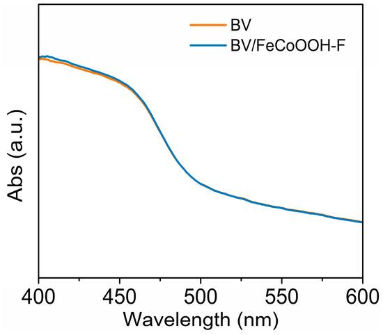 Charge transfer kinetics analysis: In general, the PEC water splitting efficiency is limited by three primary factors, which are light absorption, charge separation, and charge injection efficiencies (ηabs, ηsep and ηinj). To investigate the origin of the improved performance, ultraviolet/visible diffuse reflectance (DRS) spectroscopy was carried out. As shown in Figure 3, compared with BV, the absorption edge of the BV/FeCoOOH-F photoanode shows no significant change, indicating that the introduction of FeCoOOH-F has a negligible effect on the ηabs.
