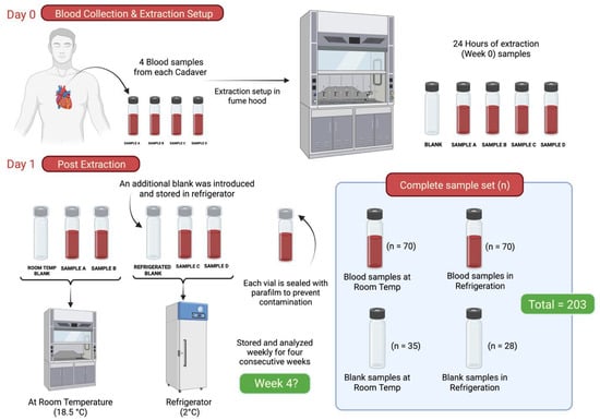 Postmortem blood samples were collected from seven cadavers, resulting in 28 sample replicates (four per cadaver). These samples were analyzed once per week over a four-week period. Additionally, two environmental control blanks were introduced for each subject sample set at Week 0. For each subject, one control sample was stored at room temperature (≈18.5 °C) and another under refrigeration (2 °C), alongside the corresponding blood samples. In total, 203 replicates were processed as part of the longevity study.