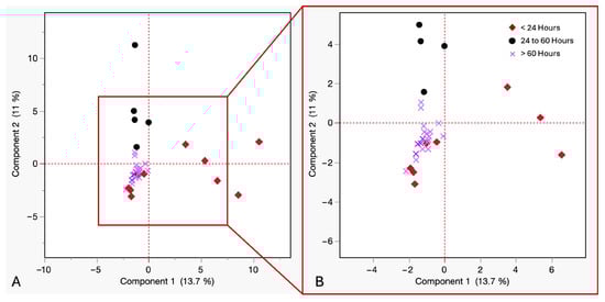 (A) PCA of VOCs in cadaveric blood samples by time of withdrawal postmortem at room temperature. Red diamonds ≤ 24 h, purple crosses = 24 to 60 h, black circles ≥ 60 h. (B) Close up view of squared in region.