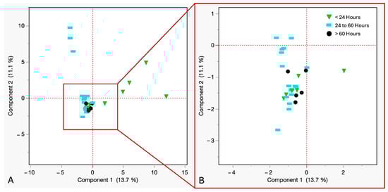 (A) PCA of VOCs from refrigerated cadaveric blood samples grouped by time of withdrawal. Downward green triangles ≤ 24 h, sky blue rectangles = 24 to 60 h, black circles ≥ 60 h. (B) Close up view of the coordinates.